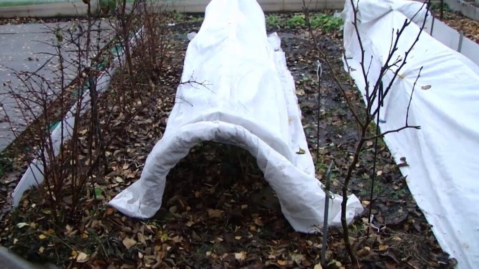 Следующий шаг — обрезка кустов, оставляя стебли высотой 30-40 см, после чего каркас необходимо покрыть укрывным материалом. Для большинства сортов достаточно двух слоев спанбонда, в то время как для более чувствительных можно использовать три слоя. Обязательно оставьте небольшие отверстия для вентиляции.