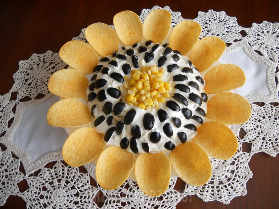 Перед подачей стоит поставить салат в холодильник на час, а завершить оформление, украсив его картофельными чипсами, имитирующими лепестки подсолнуха.