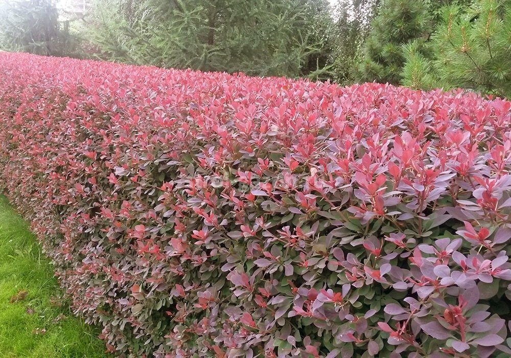 - Барбарис — этот кустарник может достигать 1,5 метра за короткое время. Известен разнообразием цветовой гаммы листьев: от зеленых до ярко-пурпурных. Его острые шипы делают живую изгородь надежной преградой. Рекомендуется высаживать растения на расстоянии 25-30 см друг от друга.