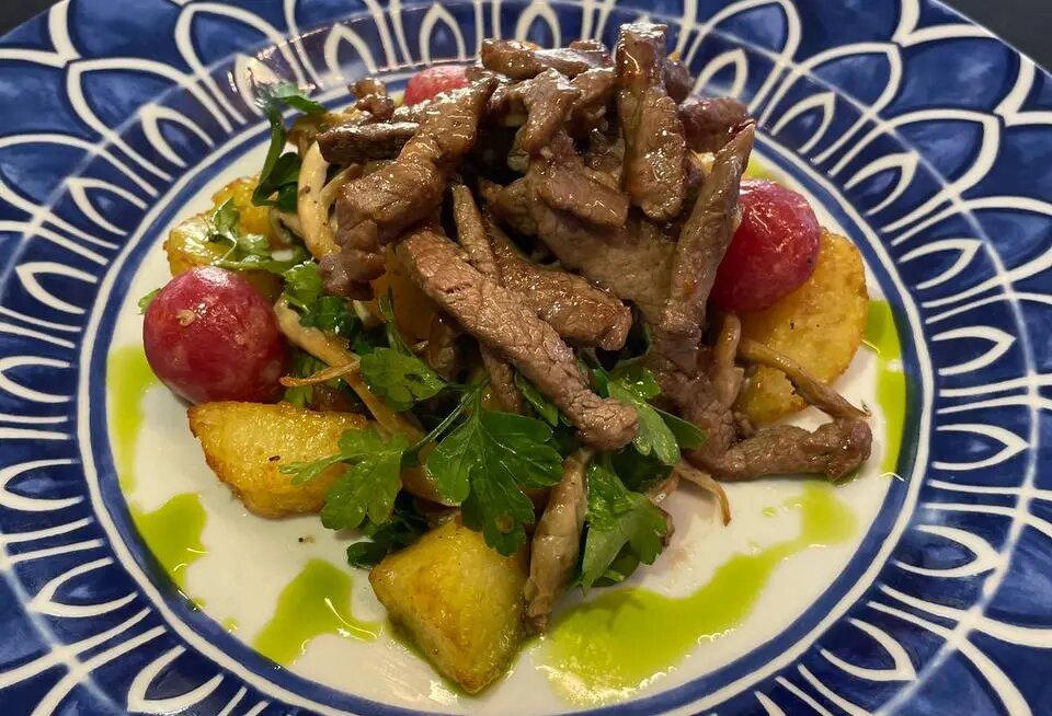 Приготовление начинается с нарезки говядины и её обжаривания на растительном масле до золотистой корочки. Картофель отваривают, затем обжаривают с вешенками, добавляя специи. Все компоненты смешиваются, образуя яркий и сытный салат.