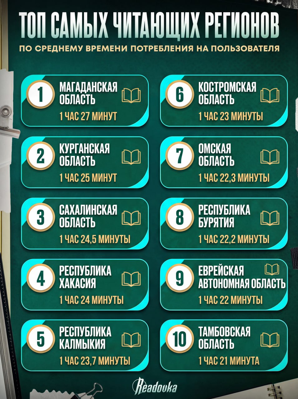 Магаданцы оказались самыми читающими в 2025 году. В среднем в день они проводили за электронными и аудиокнигами 1 час 27 минут. Почетные второе и третье места заняли Курганская (1 час 25 минут) и Сахалинская (1 час 24 минуты) области, сообщили Readovka в «Литрес». С топом самых читающих регионов можно ознакомиться в нашей карточке.