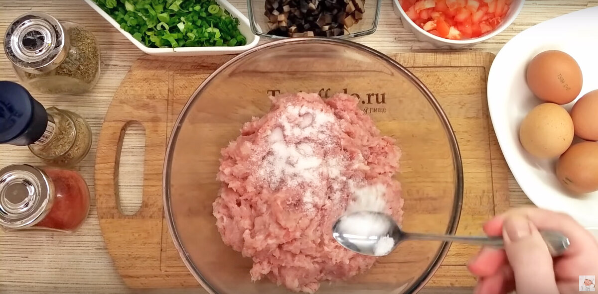 В первую очередь стоит приправить фарш, добавив к нему соль и любимые специи: сладкую паприку и молотый черный перец. Важно хорошо перемешать массу руками для достижения однородной консистенции.