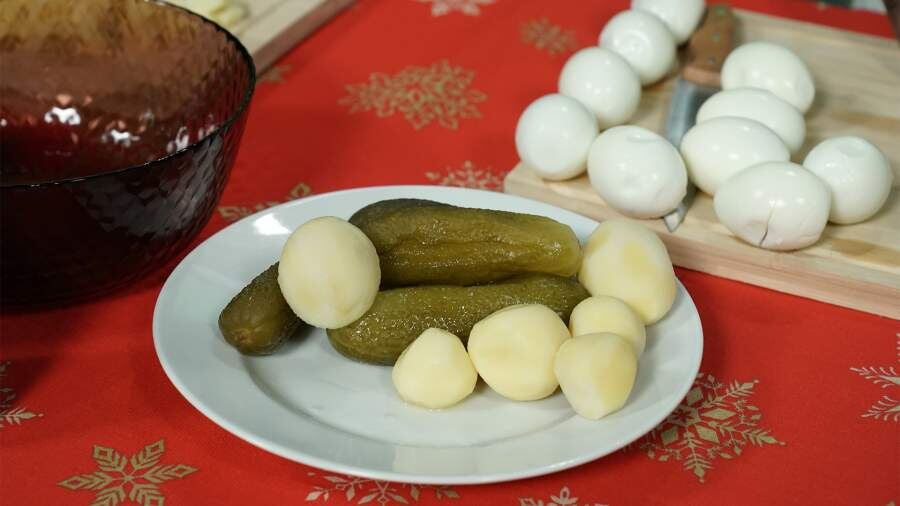 - Советский вариант: докторская колбаса, картофель, маринованные огурцы и горошек