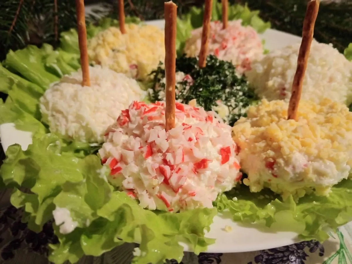 На большом блюде разложите листья салата, создавая нарядный фон. Перед формированием шариков, желательно увлажнить руки, чтобы удобно работать с начинкой. Шарики формируются аккуратно, а затем обваливаются в приготовленных «панировках»: белки, желтки, укроп и крабовые палочки.