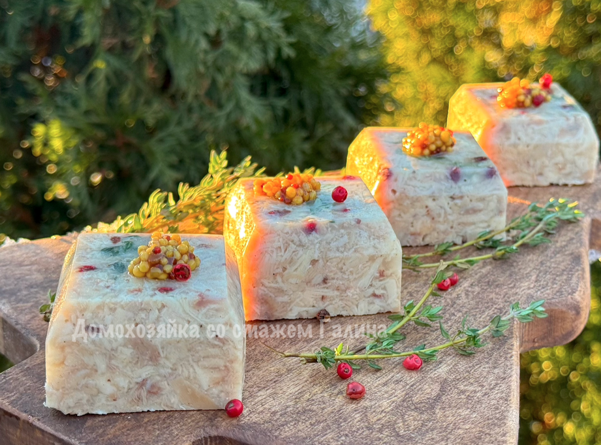 После проведенной ночи в холодильнике зельц готов к подаче. Его легко можно нарезать на порции и украсить по желанию — например, зеленью или яркими овощами. Этот упругий и насыщенный вкусом деликатес станет настоящим украшением любого новогоднего стола.