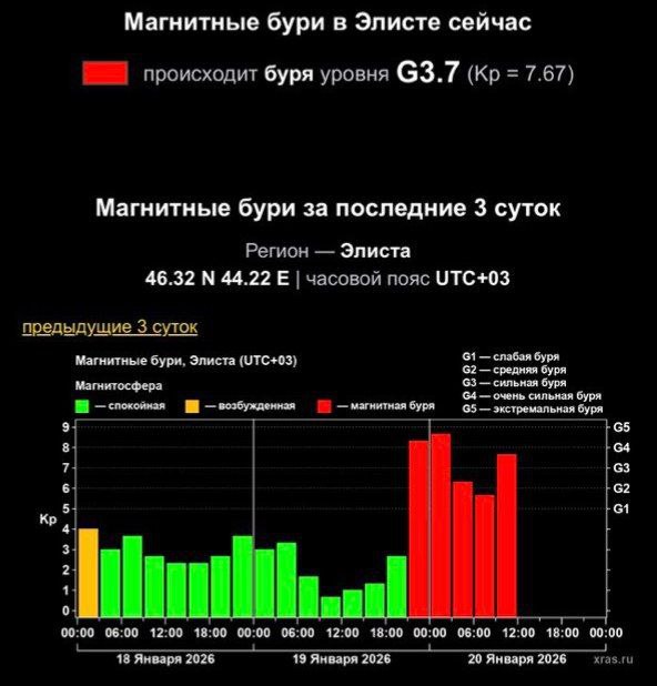 Ночью геомагнитный шторм почти достиг максимального уровня G5. К утру активность бури в Калмыкии пошла на спад, но вновь обострилась после полудня. По прогнозам специалистов лаборатории солнечной астрономии ИКИ РАН, возмущения магнитного поля планеты могут продлиться в течение всего дня.