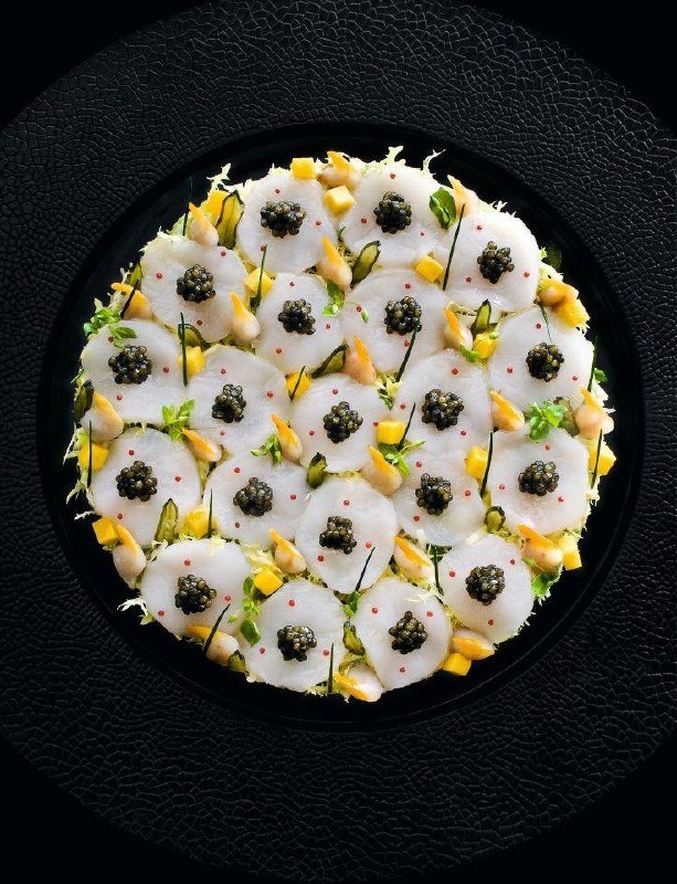Для финального акцента оставшиеся ингредиенты необходимо объединить: мелко нарезанные морские водоросли, манго, кудрявый салат и звездчатку заправляются маринадом. Салат можно украсить ломтиками гребешков и икоркой, придавая блюду изысканный вид и аппетитный вкус.