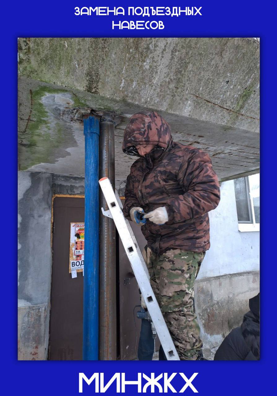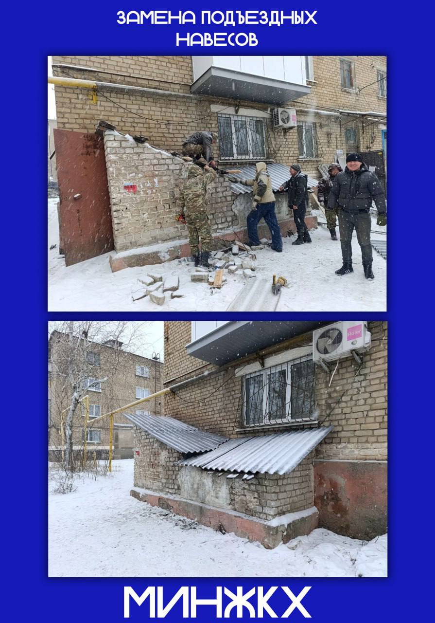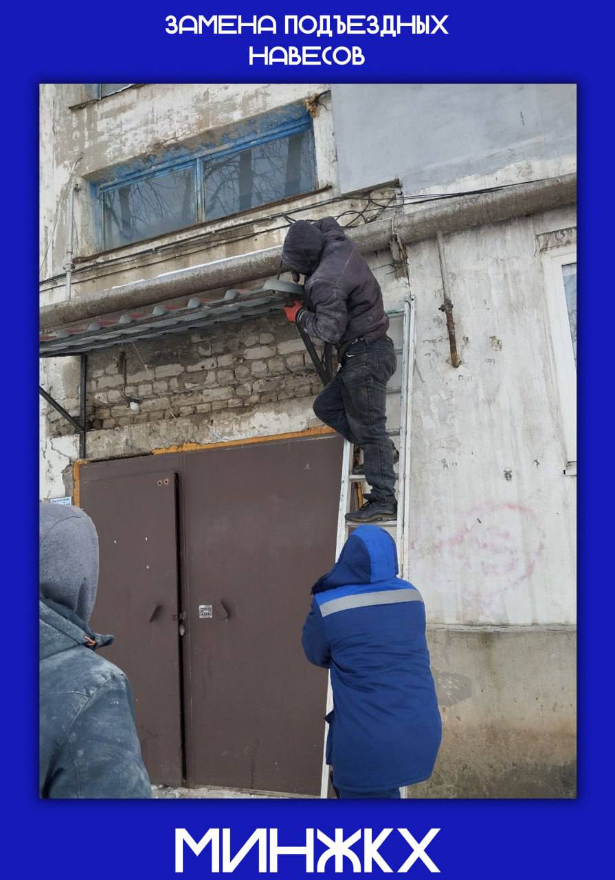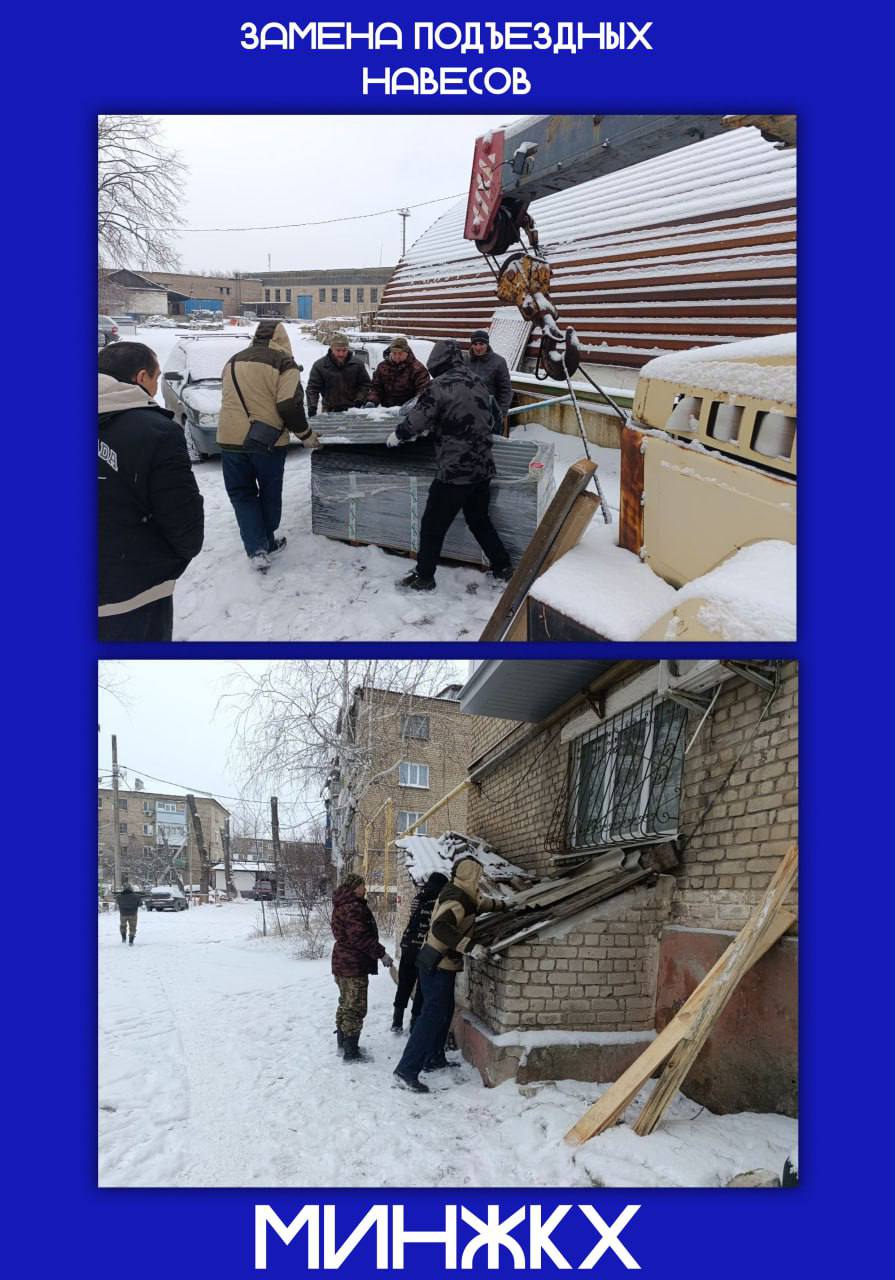 Бригады из Калмыкии продолжают масштабные ремонтные работы в г. Антрацит — на этой неделе специалисты выполнили замену подъездных навесов по улицам Петровского и Ткаленко