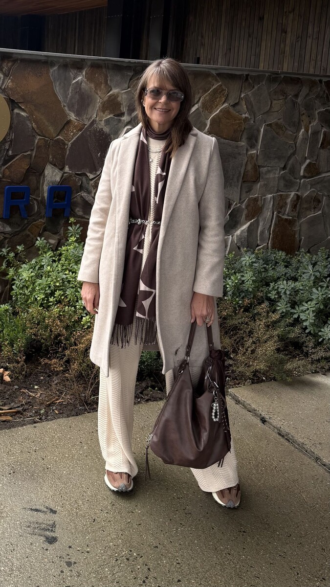 - Многослойный стиль. Основу образа составляют светлые вещи: брюки свободного кроя, свитер с небольшим воротником и прямое пальто до колен. Для разнообразия можно добавить коричневые аксессуары, такие как очки или шарф. Обувь подойдут кроссовки на платформе.