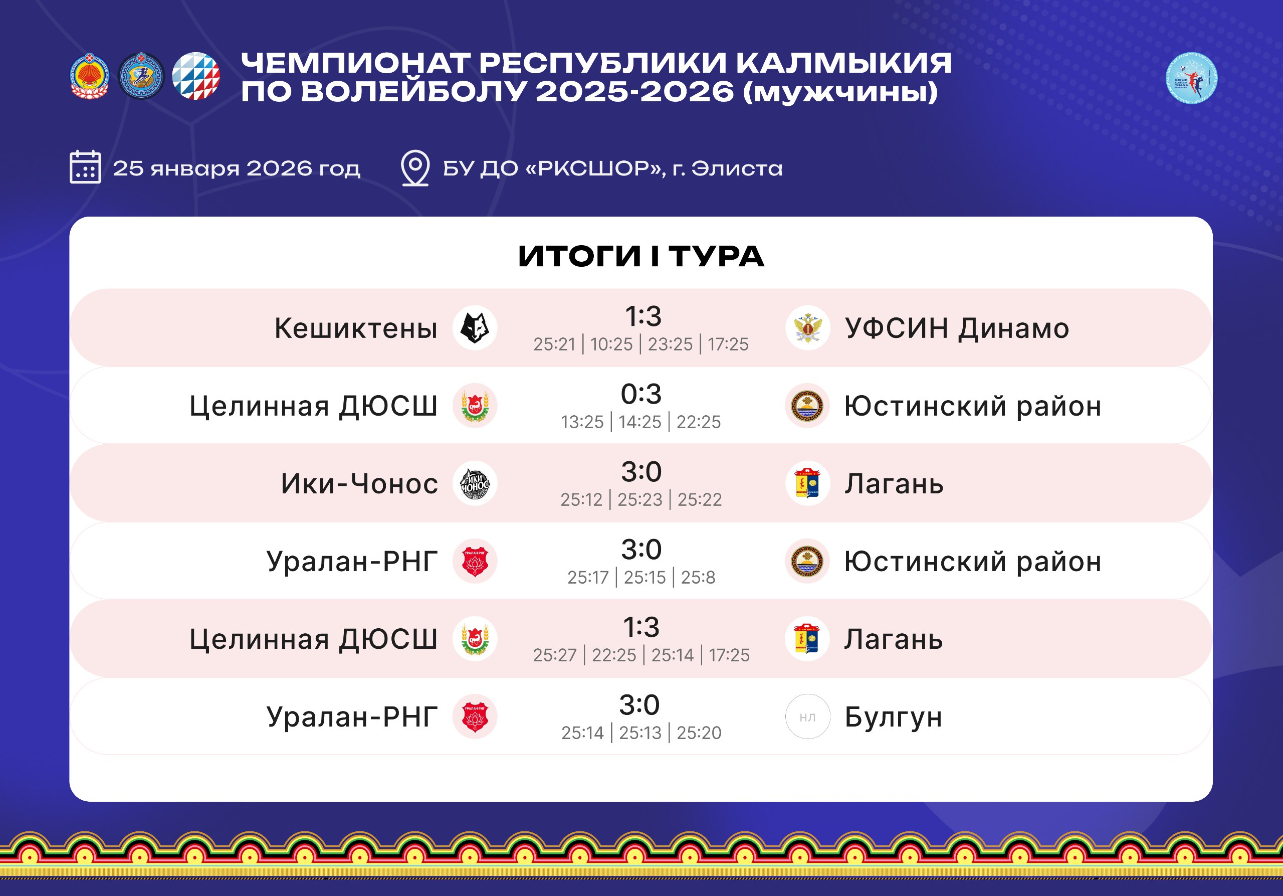 Привет! Знакомьтесь с итогами прошедших туров ЧЕМПИОНАТОВ КАЛМЫКИИ ПО ВОЛЕЙБОЛУ среди женских и мужских команд, которые состоялись 24 и 25 января!
