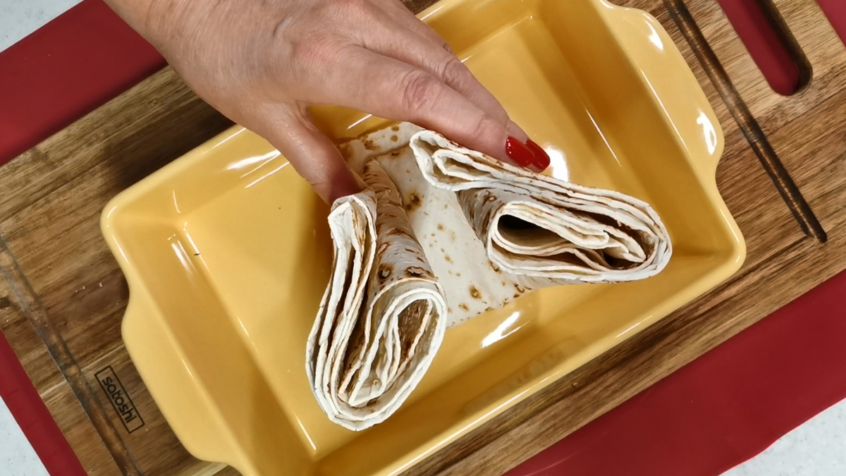 - В форму выкладываем слои: соус, лаваш с начинкой, снова соус.