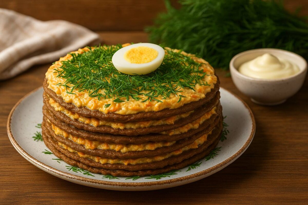 Основа торта рождается из печёночных блинов: нежные, тонкие коржи, которые держат форму. Их чередуют с начинкой на основе лука, моркови и майонеза, создавая мягкую и сытную текстуру. Весь процесс занимает минимум времени, но результата хватает на праздничный стол и на последующий день.