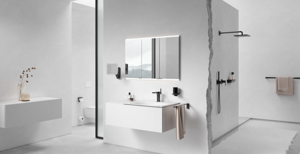 Функциональность не теряет место под стиль: регулируемые рычаги, настенные крепления и матовое покрытие устойчивы к повседневному использованию. Дизайн становится конструктором: смесители, полочки и держатели легко комбинируются друг с другом, образуя единое целое в любом помещении.