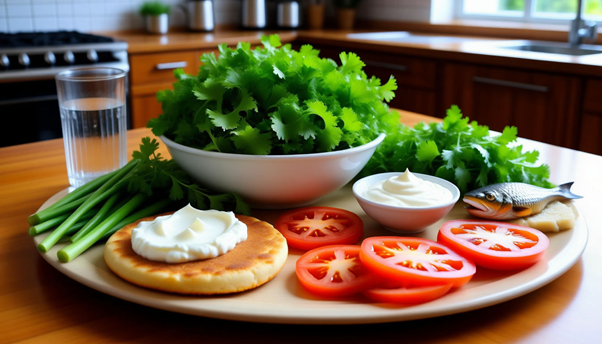 Клетчатка служит объемом и замедляет всасывание глюкозы, что помогает поддерживать стабильный уровень сахара и избегать резких голодных импульсов. Половина тарелки — овощи и зелень, чтобы увеличить объём без лишних калорий.