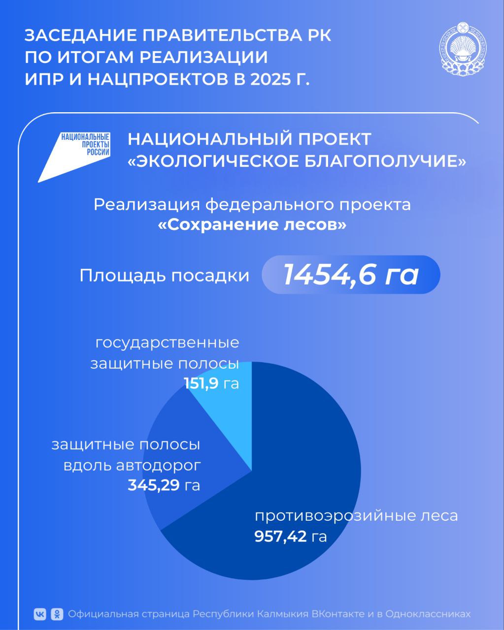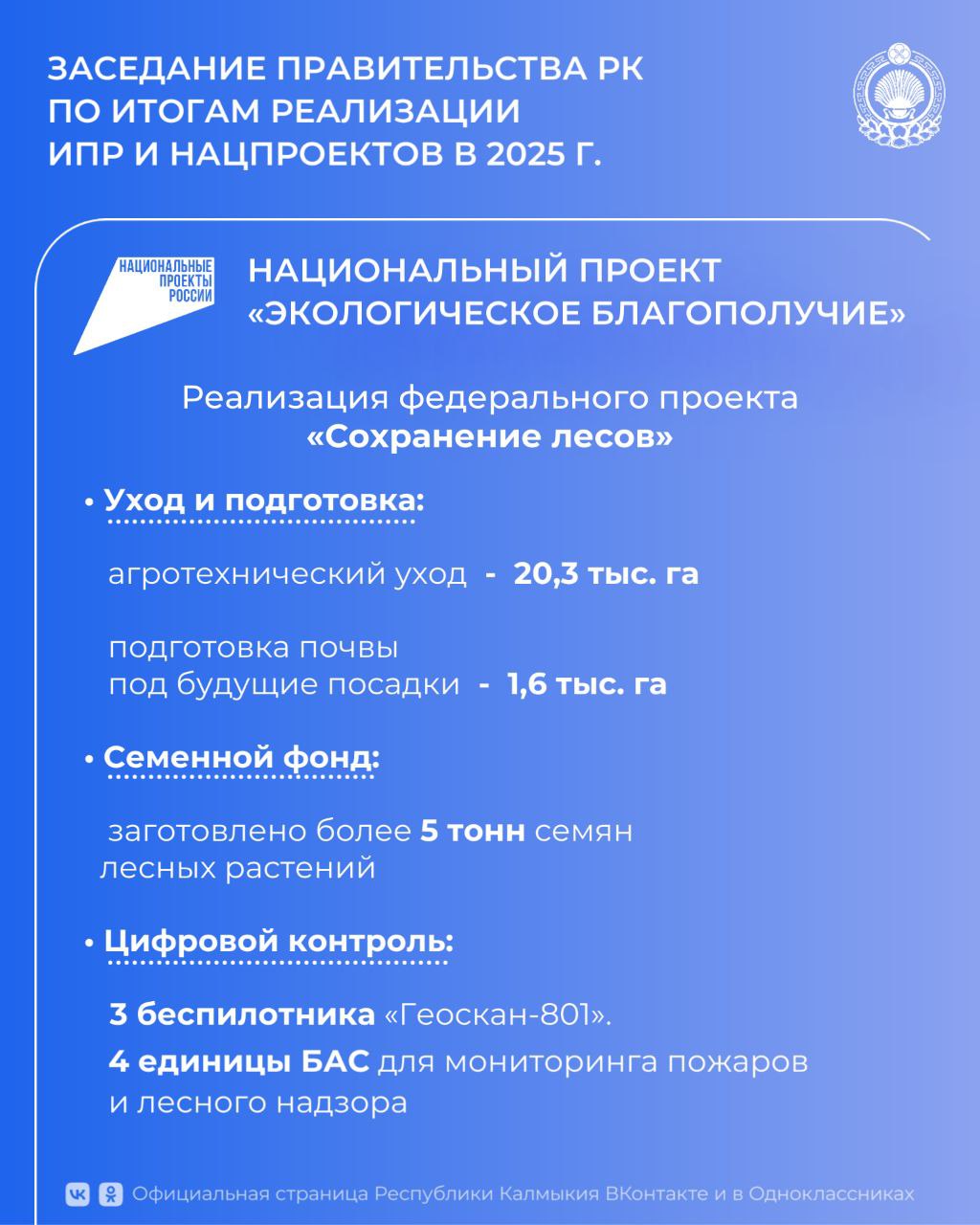 На заседании по итогам реализации ИПР и нацпроектов в 2025 г. Министр природных ресурсов и охраны окружающей среды РК Санал Годжуров отметил, что по всем запланированным мероприятиям федерального проекта «Сохранение лесов» в составе нацпроекта «Экологическое благополучие» регион полностью выполнил плановые показатели.