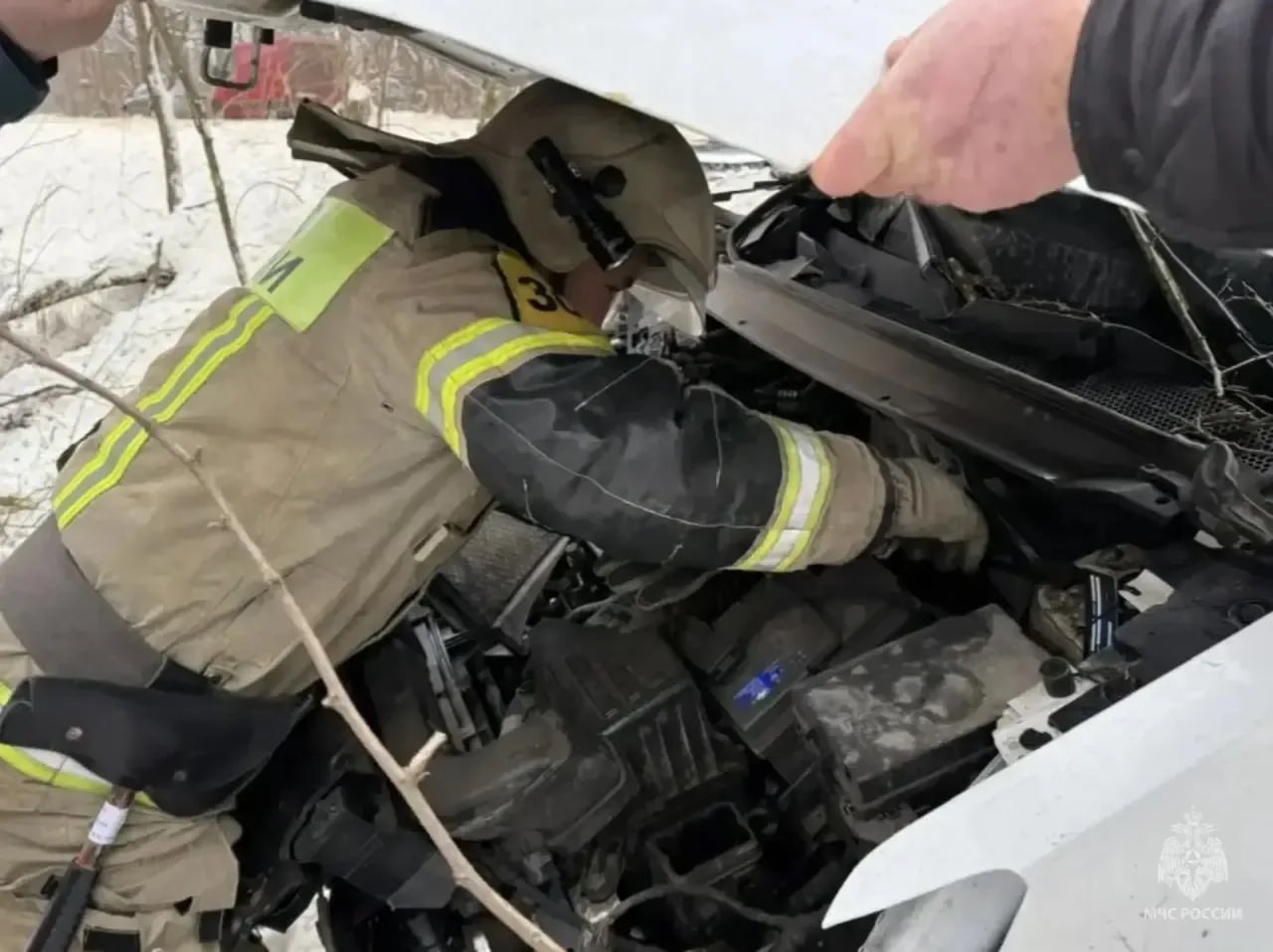 На месте происшествия спасатели обнаружили легковой автомобиль, опрокинутый в кювет. Они отключили аккумуляторную батарею транспортного средства.