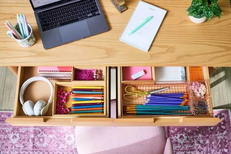 Купить удобные лотки и подставки — значит увидеть пространство как инструмент, а не как постоянно дымящийся хаос. Придумайте для каждого элемента своё место и держите его. Письменный стол может стать зоной сосредоточенности, если каждый знает, где что лежит.