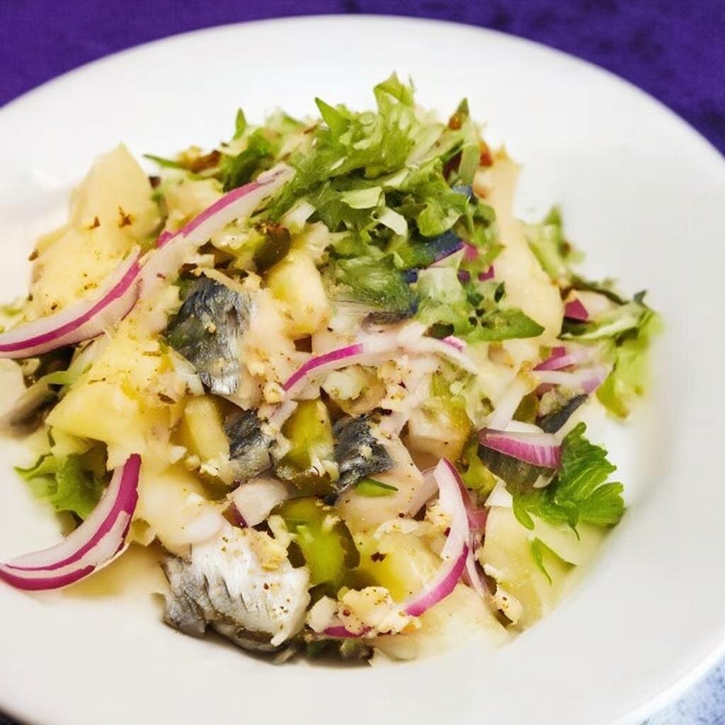 Зачем ломать голову, если в наличии есть вареный картофель, селедка и огурцы? Всё нарезается крупными кусками и аккуратно соединяется, чтобы сохранить текстуру каждого ингредиента. Вкус дополняется зернистой горчицей, майонезом или сметаной и лёгким акцентом укропа.