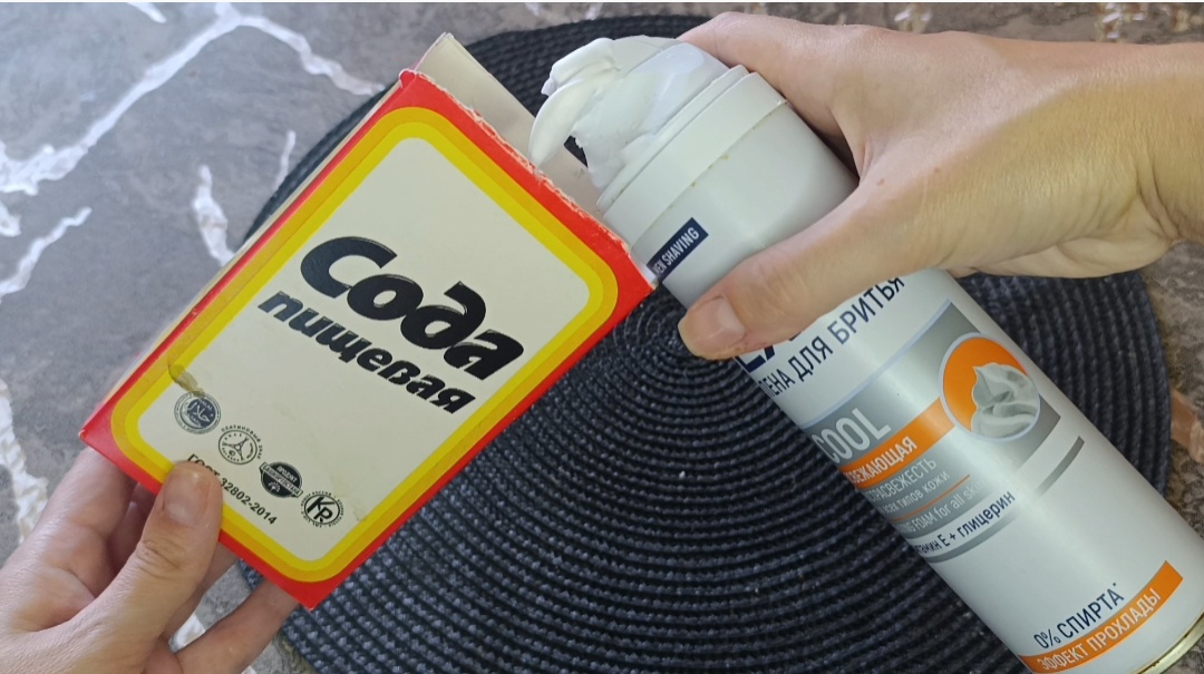 Пена для бритья выступает как легкая подложка, помогающая распределить активные вещества по площади. В сочетании с содой она становится мягким абразивом, который аккуратно снимает жир и налет, не царапая поверхности. Результат заметен: блеск и чистота без сильного запаха и агрессивных чистящих химикатов.