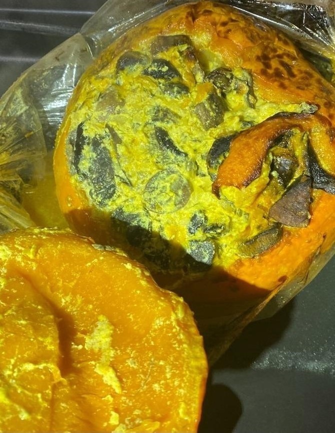 Заполненную начинкой тыкву помещают в пакет для запекания и отправляют в разогретую до 180°C духовку. Время готовки составляет один час. Зрелость блюда можно проверить по верхней части тыквы.