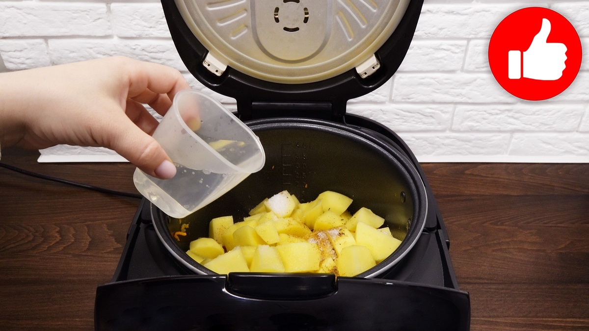 2. После окончания режима «жарка» добавьте в кастрюлю нарезанный картофель, соль, специи и горячую воду. Не перемешивайте. Установите режим «тушение» или «мультиповар» на 110°C и готовьте в течение одного часа.