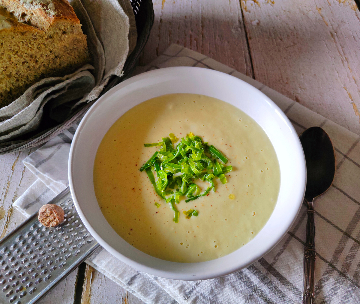 Очищенный картофель нарезать мелкими кубиками, а стебли порея разрезать вдоль, чтобы удалить возможные загрязнения. Хотя в рецепте обычно используется светлая часть, не стоит выбрасывать зелёные листья — они пригодятся для украшения готового блюда.