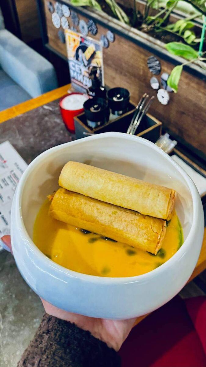 Финальный штрих — ароматное зелёное масло и свежая микрозелень, которые создают идеальный баланс между дымным вкусом рыбы, сладостью манго и остротой чили. Каждая трубочка — это симфония текстур: хруст и мягкость, свежесть и насыщенность, классика и эксперимент.