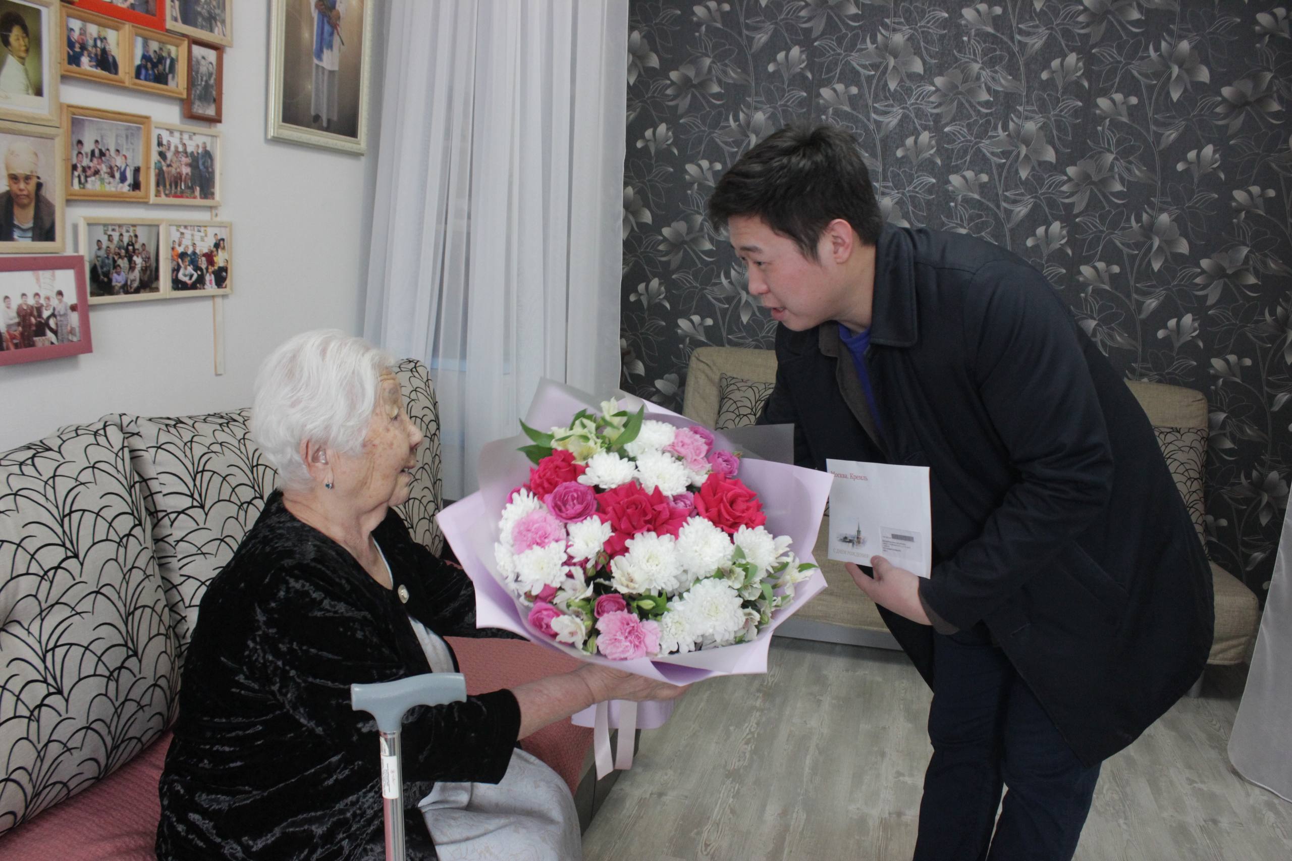 Поздравить Анну Батыровну с днём рождения пришел депутат #ЭГС Санал Доржеев. В этот особенный день ей были вручены цветы, персональное поздравление от Президента России В. В. Путина и подарок от муниципалитета. Депутат выразил глубокую благодарность Анне Батыровне за ее неоценимый вклад в Великую Победу и пожелал ей крепкого здоровья и долгих, счастливых лет жизни.