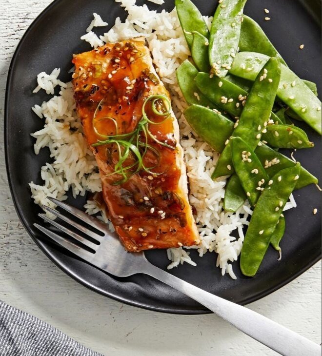 Запеченный лосось лучше всего подавать с гарниром из риса и свежими овощами. Этот легкий и питательный обед понравится всем вашим гостям, а восточный вкус дополнит атмосферу уюта.