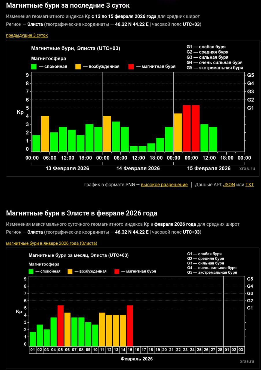 Ранее магнитная буря также слабого уровня в текущем месяце была зарегистрирована 5 февраля. Перерыв, таким образом, составил 10 суток. Пока февраль 2026 года выглядит более спокойным, чем предыдущий месяц. В прошедшем январе, который, как ранее сообщалось, установил рекорд десятилетия по числу дней с магнитными бурями, основная активность наблюдалась во второй половине месяца.
