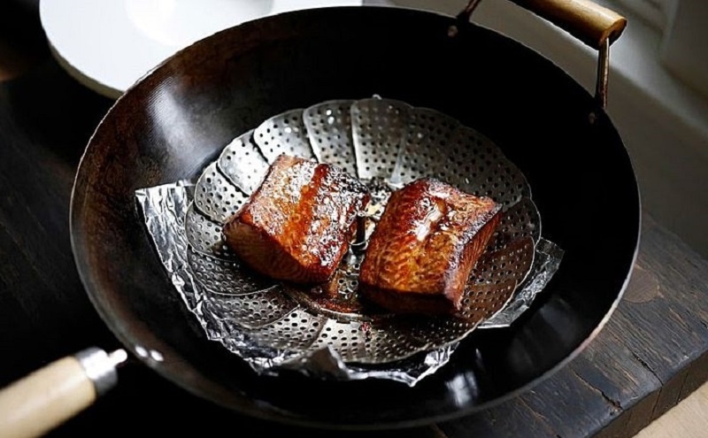 Основная задача – равномерно пропитать пищу дымом. Глубокая сковорода обеспечит нужное пространство, а стружка, например, яблони или вишни, придаст блюдам уникальный аромат. На дно сковороды укладывается фольга, на которую помещается древесная стружка, чтобы избежать пригорания. Сверху устанавливается дуршлаг или сито, где и будут готовиться продукты.