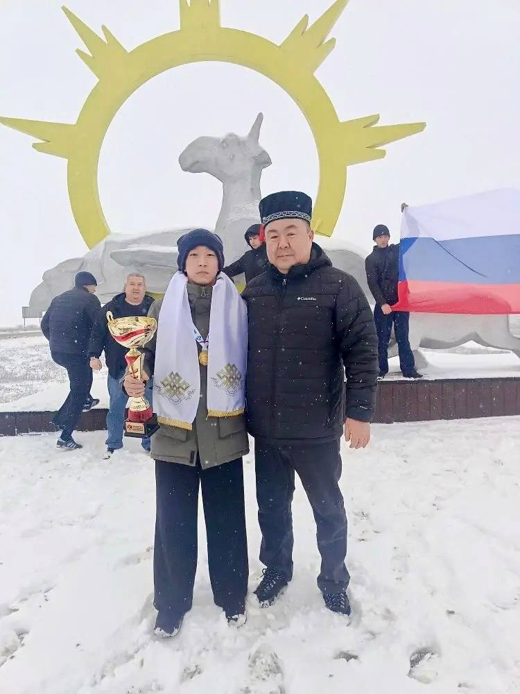 Накануне юный спортсмен вернулся из Иркутска, где завоевал золото в весовой категории до 45 кг. Глава района Баатр Джекиев поздравил Алдара с победой и объявил, что чемпиону дарят жеребёнка — как символ удачи и будущих успехов.