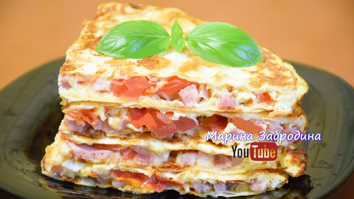 Затем равномерно распределяют взбитые яйца, добавляют нарезанную ветчину и помидоры, а сверху – оставшуюся половину сыра.