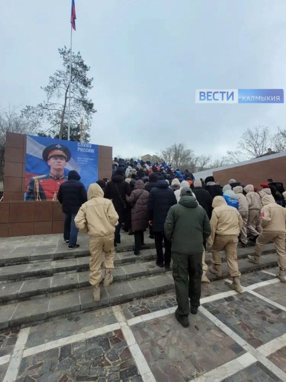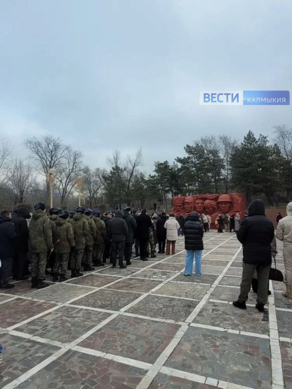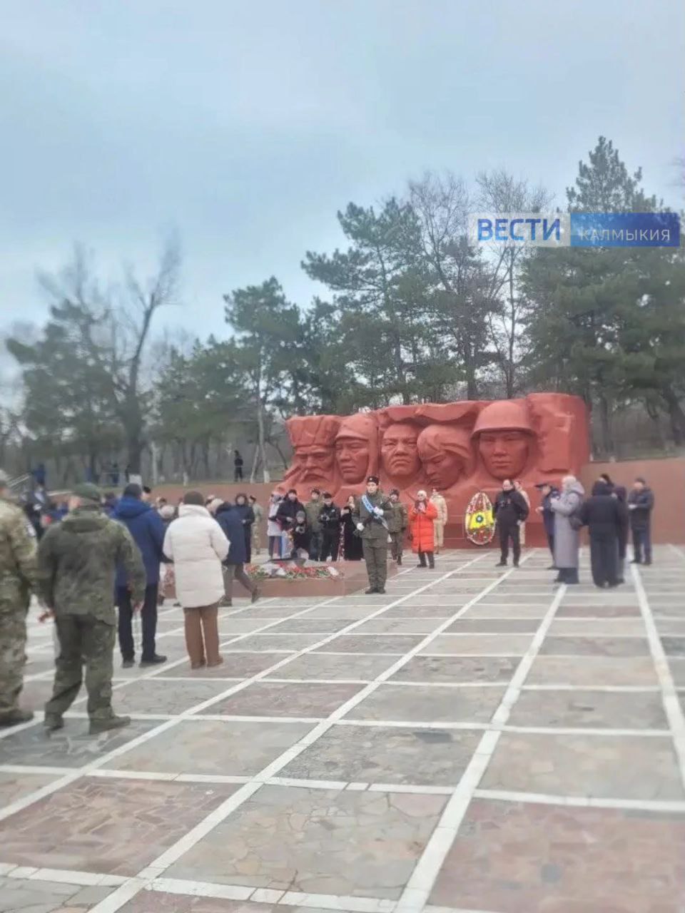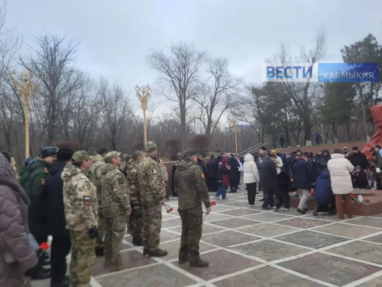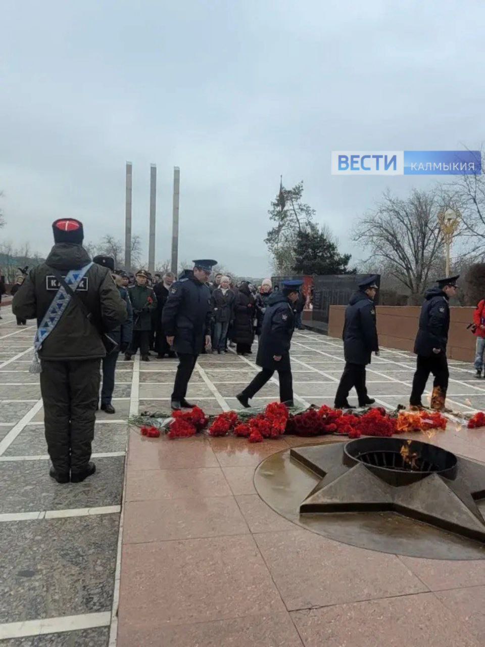 Вечный огонь» прошло возложение цветов. В памятной церемонии приняли участие Глава Калмыкии Бату Хасиков и ветеран Великой Отечественной войны Пётр Леонтьевич.