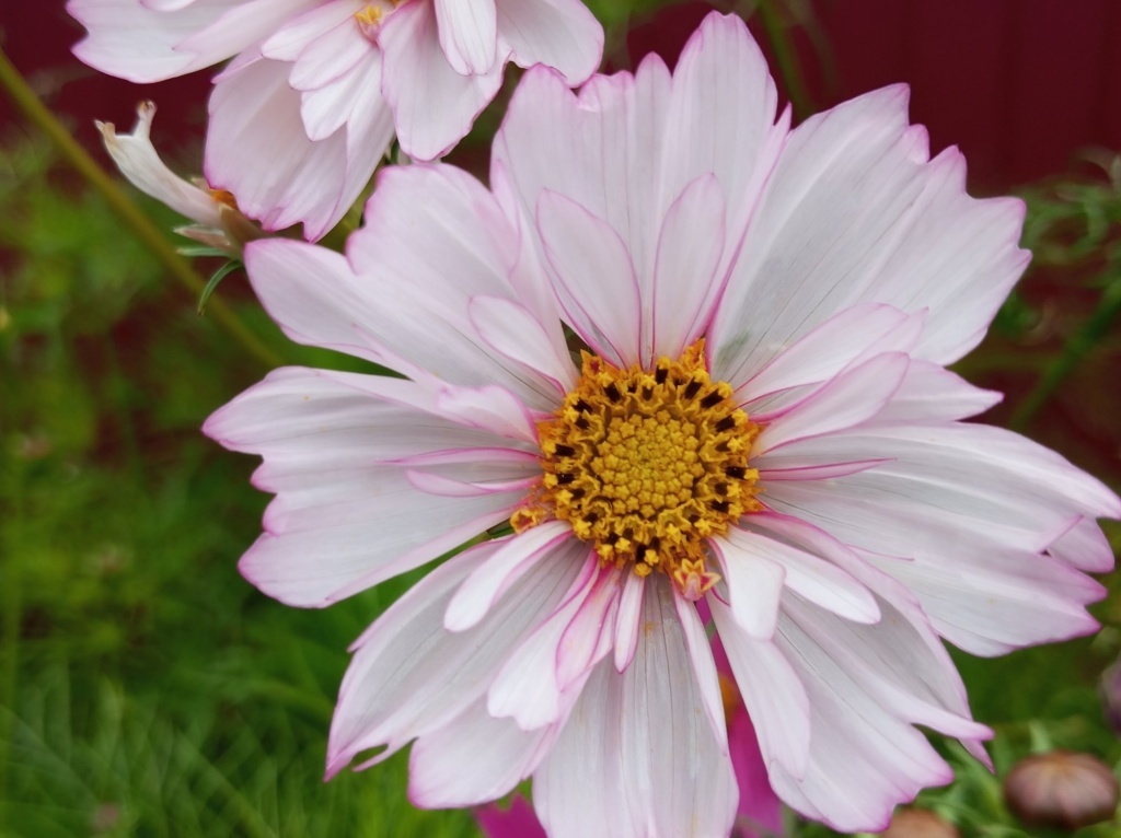- 1. Космея: Этот цветок с пышными соцветиями бывают в различных расцветках. Уход не сложен, полив нужен лишь в засуху. Он легко самосеется.