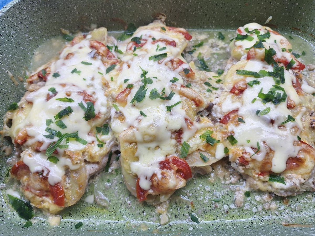 Лук режется полукольцами и укладывается поверх индейки, а картофель, очищенный и нарезанный кружочками, становится следующим слоем. Его слегка солят и покрывают оставшимся соусом, чтобы он попал между ломтиками. Затем на картофель укладываются нарезанные полукольцами помидоры, которые придадут блюду сочность и лёгкую кислинку. Завершает процесс натертый сыр, который образом создаст аппетитную корочку.