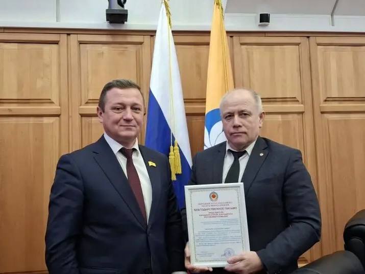 Артем Михайлов вручил Главному федеральному инспектору по РК Александру Беляеву Благодарственное письмо Председателя Народного Хурала (Парламента) Республики Калмыкия за плодотворное сотрудничество и слаженную работу. Награждение состоялось в рамках 28-й сессии регионального парламента.