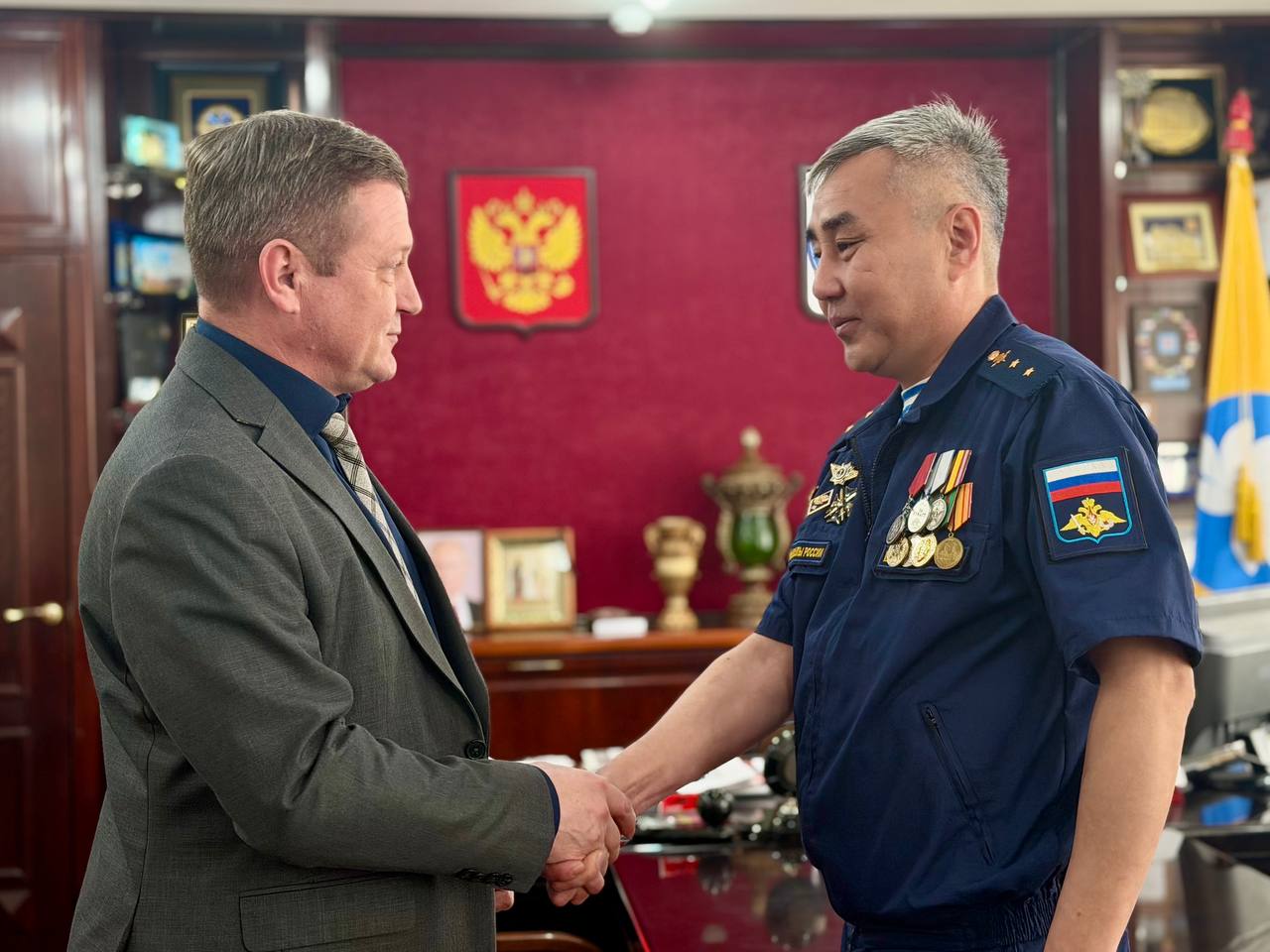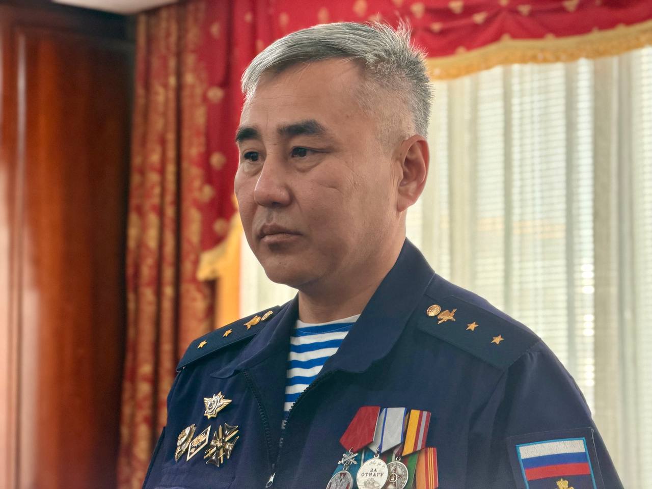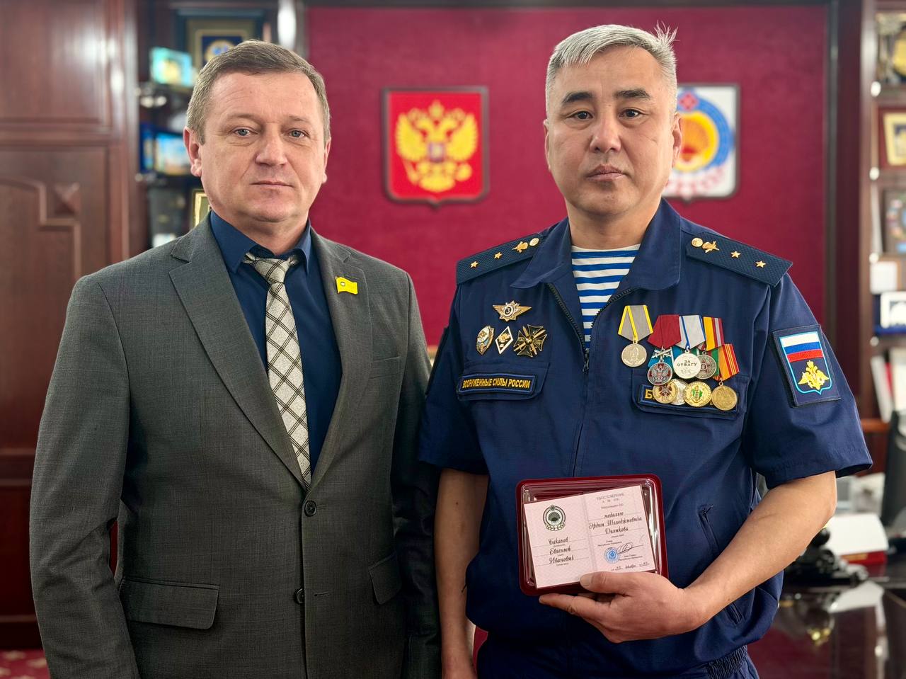 По поручению Главы Республики Калмыкия спикер регионального парламента Артем Михайлов вручил медаль имени Эрдни Теледжиевича Деликова участнику специальной военной операции Евгению Баканову.