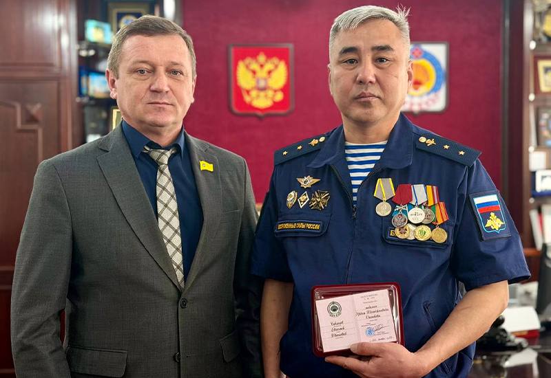 По поручению Главы Калмыкии Бату Хасикова, спикер регионального парламента Артем Михайлов торжественно вручил медаль имени Эрдни Деликова участнику специальной военной операции Евгению Баканову за мужество и отвагу, проявленные при исполнении воинского и гражданского долга.