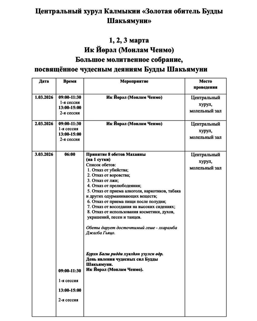 С 1 по 3 марта в Центральном хуруле «Золотая обитель Будды Шакьямуни» состоятся молебны «Ик Йрл». Они состоятся в течение священного 15-дневного периода после наступления Цаан сара. Считается, что именно в эти дни несколько тысячелетий назад Будда Шакьямуни совершил пятнадцать великих деяний.