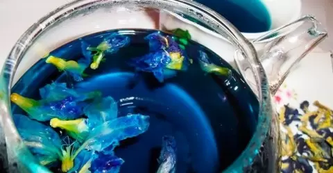 Эта удивительная бирюзовая окраска напитка обусловлена лепестками клитории тройчатой, известной также как «мотыльковый горох». Чай имеет множество названий: «анчан», «голубая бабочка», а в Китае его называют «Чанг Шу». Яркие цветки клитории широко используются не только в кулинарии, но и в народной медицине.