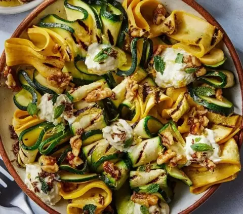 Отдельно обжарьте грецкие орехи на сковороде без масла, превратив их в золотистые кусочки, которые нужно крупно покрошить и добавить к кабачкам. Затем добавьте рикотту и нарезанную зелень базилика и мяты. Приправьте все оливковым маслом, солью и перцем по вкусу — это будет великолепным дополнением к жареным цыплятам на гриле.