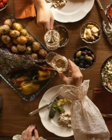 Среди всех блюд выделяется запеченная лопатка ягненка. Это главный акцент праздничного стола, поданный с ароматными запеченными перцами и картофелем, который не оставит равнодушным никого из гостей. Такой подход к традиционной кулинарии добавляет оригинальности и вызывает аппетит.