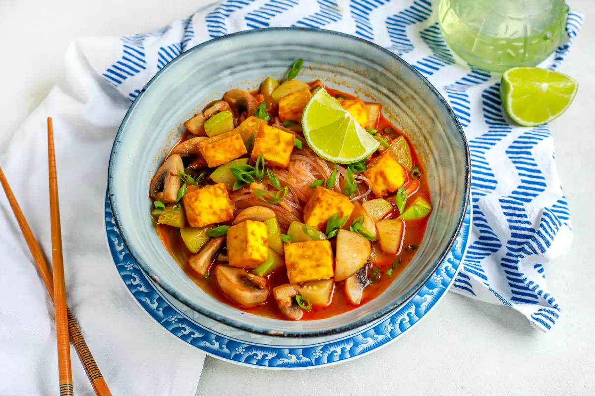 Шаг 2: Вскипятить 1 литр воды и залить фунчозу в миске, оставить на 7-10 минут. Затем промыть холодной водой. Кабачок нарезать средними кубиками, а корень имбиря натереть на мелкой терке. Шампиньоны лучше очистить, а затем нарезать пластинками. Разогреть сковороду, добавить 1 столовую ложку растительного масла и обжаривать грибы на среднем огне 2-3 минуты. Затем добавить кабачки и продолжить жарить еще 3-4 минуты. Вскоре добавить тертый имбирь, овощной бульон, пасту том ям, посолить и поперчить, и варить еще 3-5 минут на слабом огне, учитывая, что пасту нужно добавлять по вкусу — она острая.