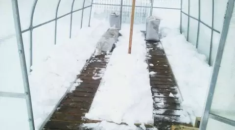 Внутри теплицы выберите участок, где снег тает быстрее — обычно это середина или солнечные грядки. Убирать снег полностью не нужно, достаточно сгрести его с основной грядки на дорожки или сделать бороздки прямо в снежной массе.