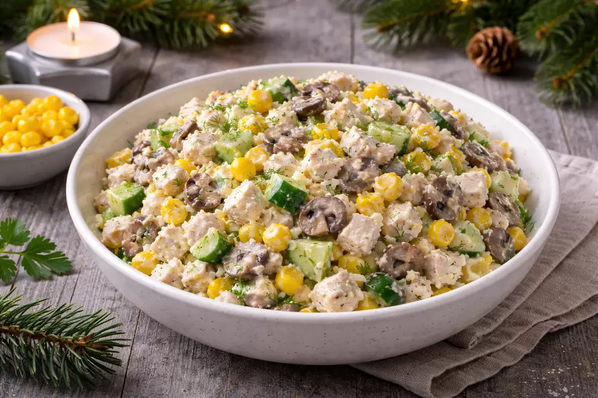 В глубокой миске объединяются куриное филе, яйца, картофель, огурец, большая часть кукурузы, обжаренные грибы с луком и тёртый сыр. Добавляется майонез, и всё аккуратно перемешивается, чтобы сохранить воздушность. При необходимости добавляется немного соли или перца для улучшения вкуса.