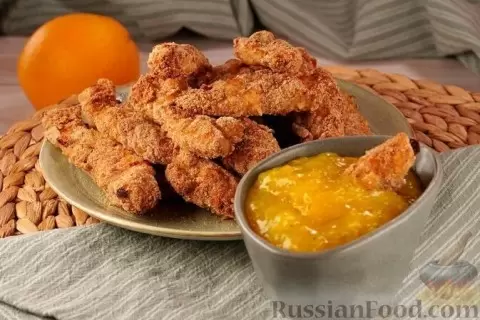 - Куриные стрипсы с апельсиновым соусом: Хрустящие стрипсы, приготовленные в маринаде из апельсинов и соевого соуса, станут настоящим хитом вечера.