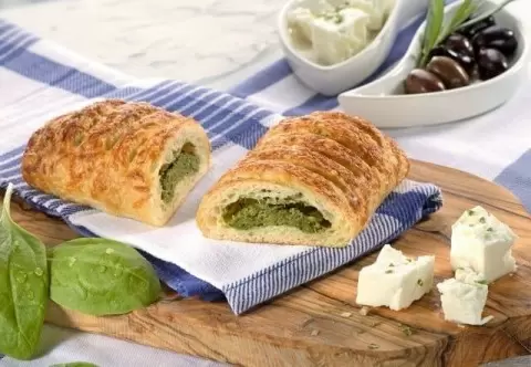 - Греческий штрудель со шпинатом и сыром – ароматная слойка, созданная из качественного масла с сочным шпинатом и острым сыром «Фета», притягивает взгляды и радует вкус.