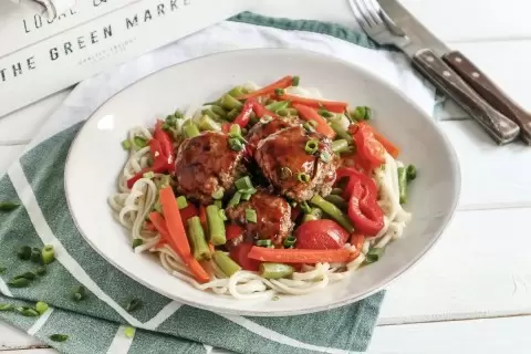 Тушение с овощами: К обжаренным фрикаделькам добавьте морковь, фасоль и сладкий перец. Влейте соевый соус и яблочный сок, и тушите, пока вся жидкость не выпарится. Напоследок мелко нарежьте зеленый лук и добавьте его в сковороду, перемешав все ингредиенты. Примерно 8-12 минут, и ваше блюдо готово.