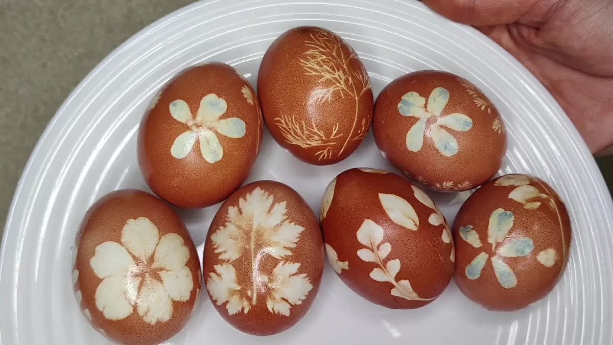 После нанесения узоров оберните яйца капроном, фиксируя элементы на месте. Затем поместите их в отвар из луковой шелухи на 30 минут — для более выраженного цвета лучше оставить на ночь. После того как яйца достигли желаемого оттенка, вынимайте их и дайте полностью высохнуть на бумажном полотенце. Для эффекта блеска можно слегка смазать поверхность растительным маслом.